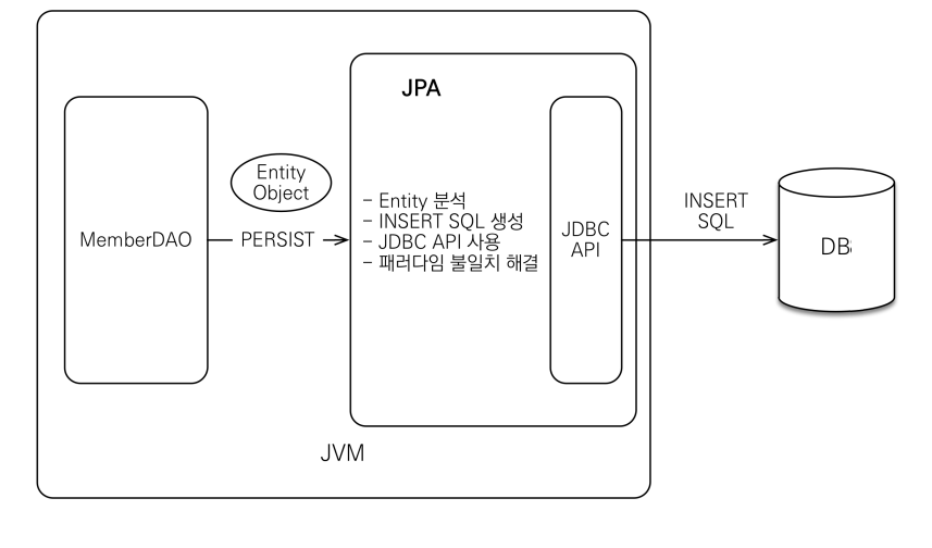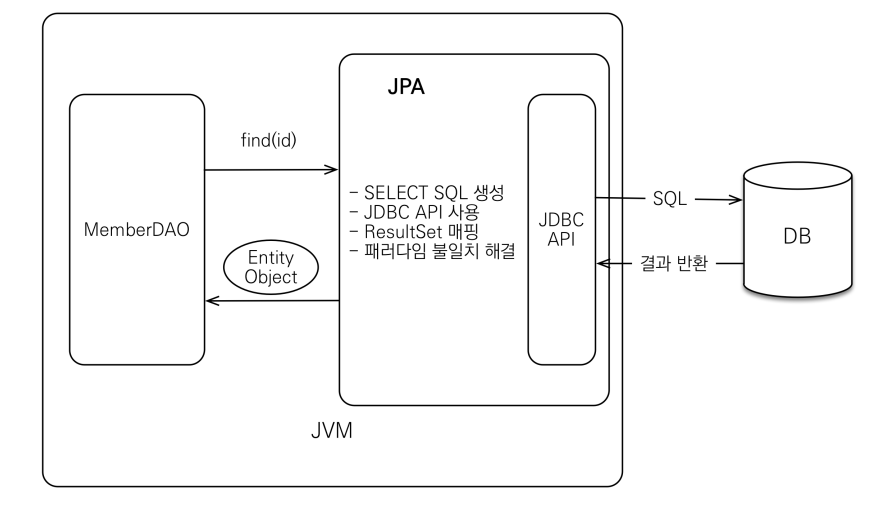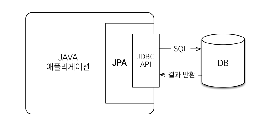 JPA는 애플리케이션과 JDBC 사이에서 동작한다. 즉, 개발자가 직접 JDBC API를 사용하는 것이 아니라 JPA 내부에서 JDBC API를 사용해 SQL을 호출하고 DB와 통신한다.