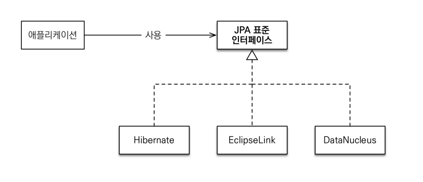 - JPA 2.1 표준 명세를 구현한 3가지 구현체로는 Hibernate, EclipseLink, DataNucleus가 있다.