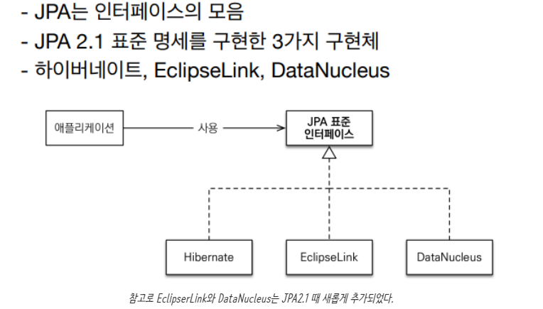 JPA는 특정 기능을 하는 라이브러리가 아니고, ORM을 사용하기 위한 인터페이스를 모아둔 것입니다.